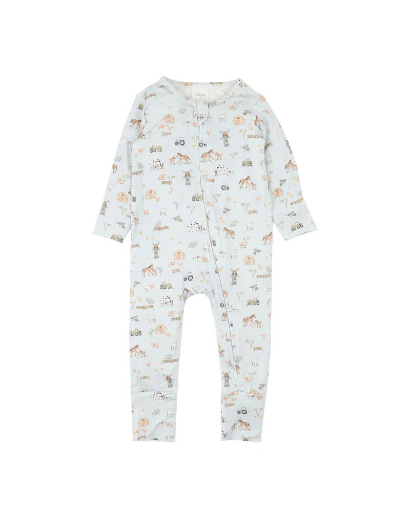 Let your little one drift off to sleep or enjoy a day of play in this charming farmyard zip romper. Featuring an adorable all-over print of barns, animals and tractors on a soft blue base, it brings a touch of country whimsy to everyday dressing. Made from a beautifully breathable EcoCosy™ viscose blend, it’s designed for comfort and stretch. The practical two-way zip makes changes a breeze, and the fold-over cuffs at the hands and feet offer extra warmth when needed.
