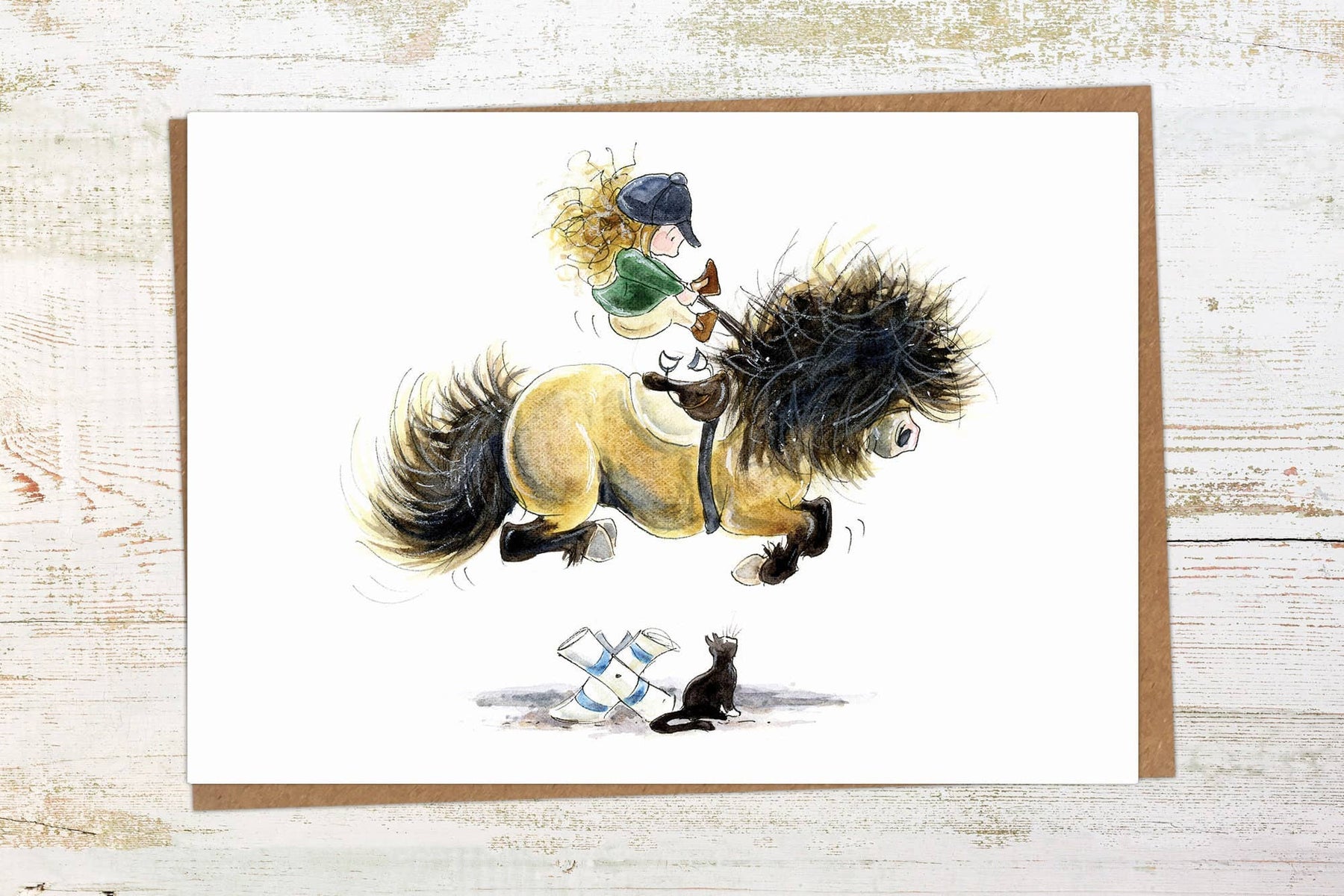 This funny pony greetings card features a rider clinging onto their pony as it cat leaps over a tiny pole jump and black cat.