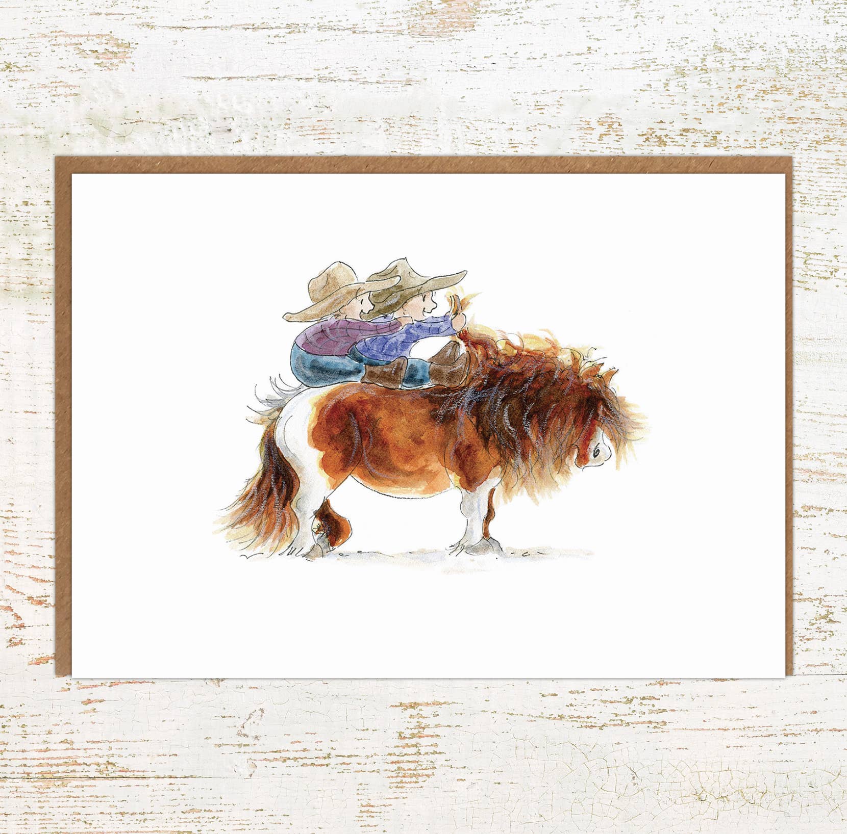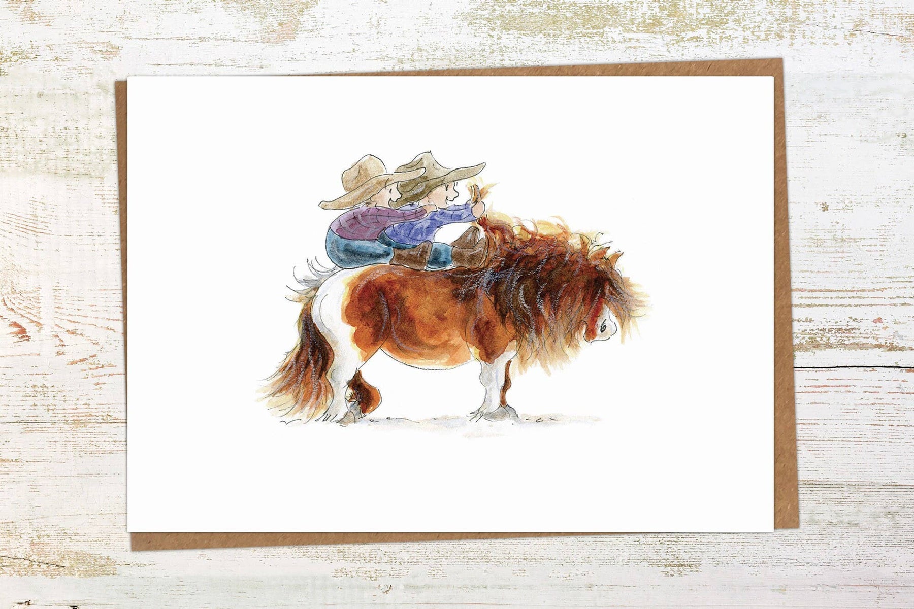 This funny pony greetings card features a cheeky duo riding a gorgeous little brown and white pony with a wild mane.