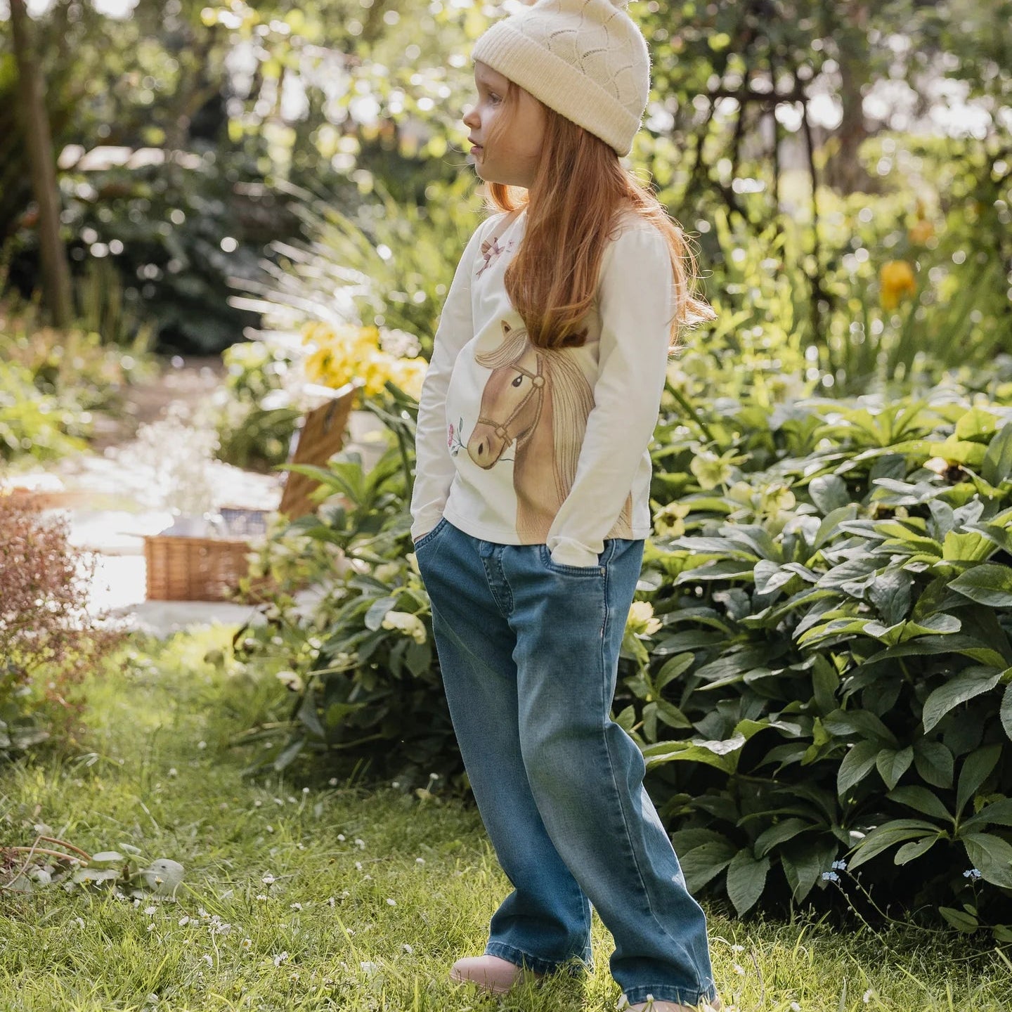 These everyday denim jeans are made for girls who love horses, even when they’re nowhere near the paddock. Designed for comfort, stretch and all-day wear, they’re crafted from soft stretch denim with an easy pull-on waistband that keeps busy days fuss-free. The sweet horse embroidery on the back pocket adds a thoughtful horse-lover touch, making these jeans feel a little bit special while still being perfect for playtime, outings and everyday adventures.