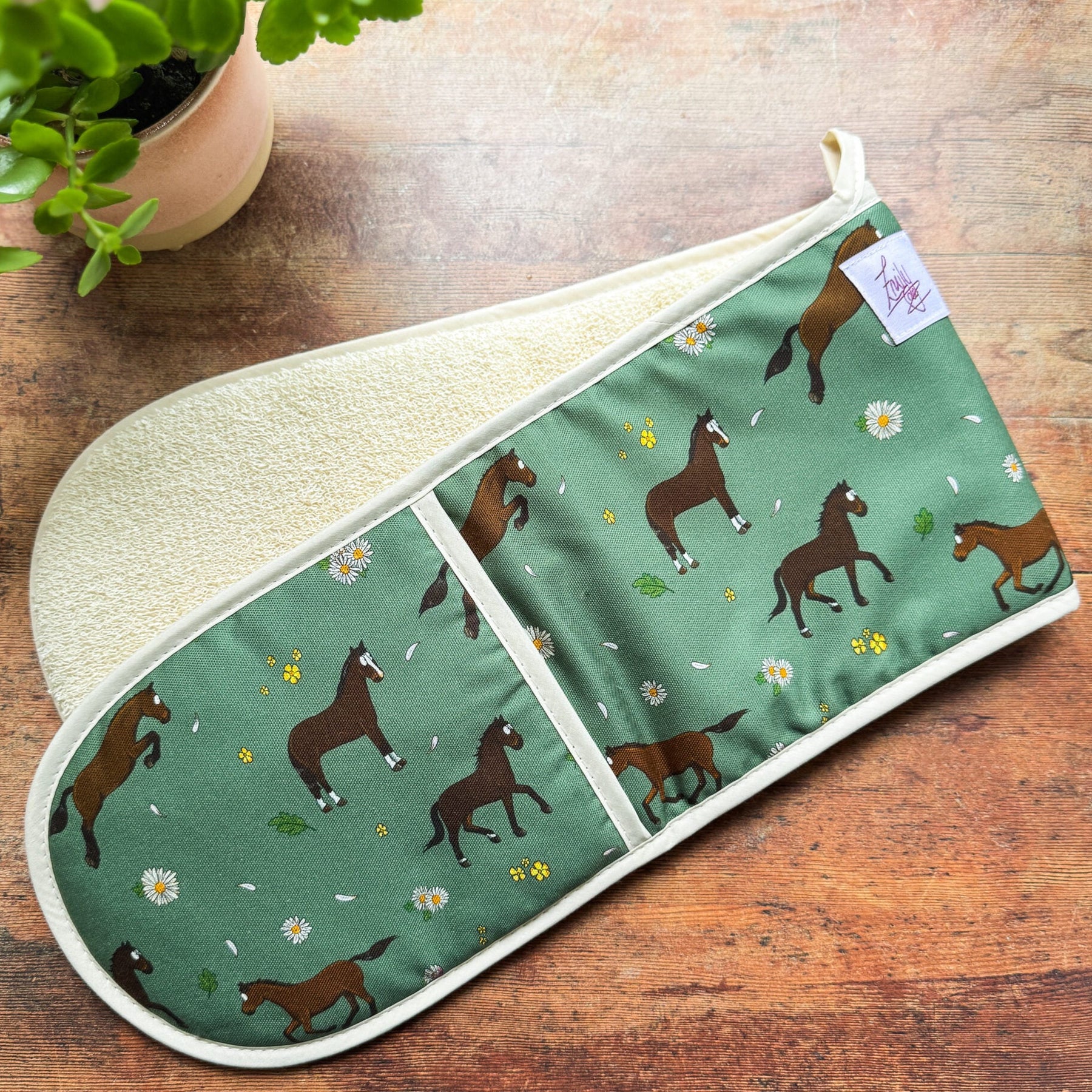 Bring a touch of countryside charm and equestrian spirit into your kitchen with our Bay Horse & Daisy patterned Double Oven Gloves.